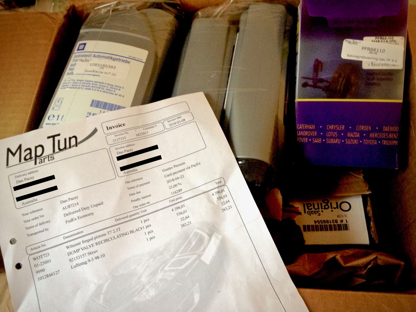 Wrong..! Instead I received 4 lots of oil, a powerflex bushing, and a box of oil filters. Gee, thanks a lot! True to their reputation, Maptun are on it already.
